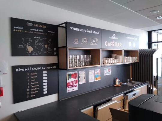 Atypické vybavení: nábytek na míru a kávová grafika v kuchyňce Mallarium